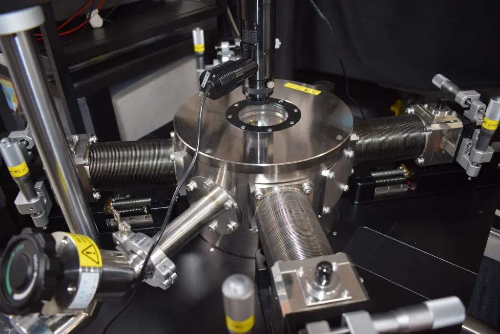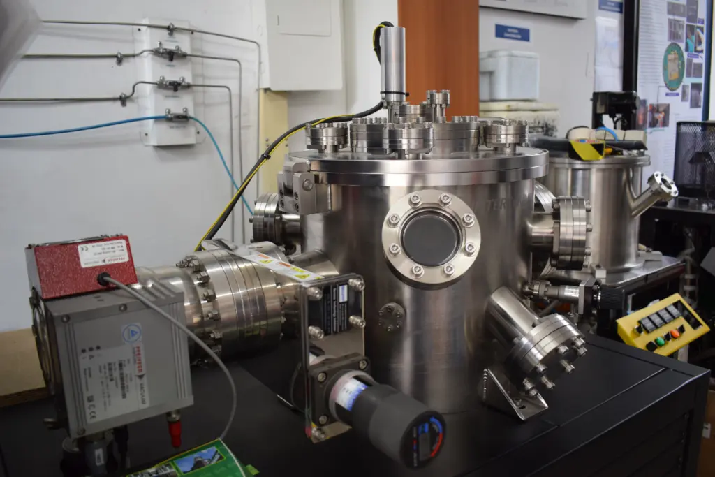 Sistema de alto vacío de fabricación de películas delgadas de hasta 12 materiales sobre sustratos por pulverización catódica asistida por campo magnético a corriente directa (“DC Magnetron Sputtering”). Sistema versátil para el acople de equipos para medidas in situ de las muestras obtenidas, adaptado para el ingreso de 3 gases y aire para el control neumático de válvulas internas, opturadores e interruptores (“shuter”). El método de “Magnetron DC co-Sputtering” es una técnica avanzada de deposición física de vapor (PVD, por sus siglas en inglés) que, específicamente este modo de trabajo del sistema, usa campos magnéticos para atrapar electrones y generar un plasma en un gas inerte (como Argón) dentro de una cámara bajo condiciones controladas de vacío, bombardeando dos o más blancos (conocidos como “targets”) de materiales diferentes con iones para expulsar sus átomos y depositarlos simultáneamente sobre un sustrato, creando tanto recubrimientos como películas delgadas o aleaciones de alta calidad para aplicaciones en ramas como la electrónica, mecánica, óptica, ingenieril y de aplicaciones a la industria en general.