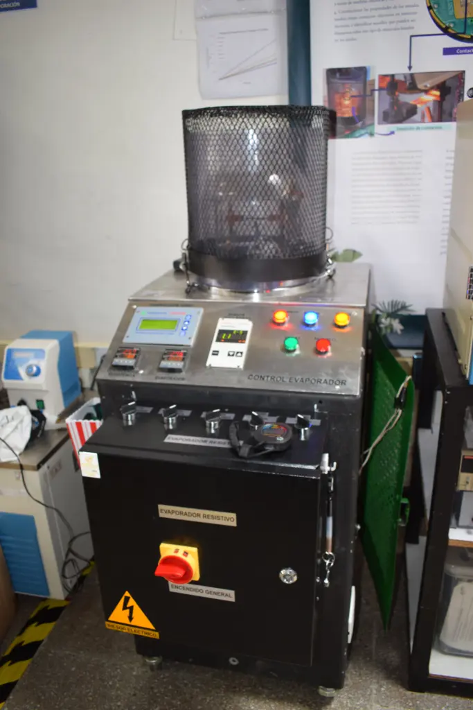 El equipo de evaporación es un proceso que permite crear una capa metálica sobre piezas metalizadas o un sustrato definido. En este último caso este equipo es usado para el depósito de metales como contactos eléctricos de los dispositivos fabricados para que puedan ser caracterizados en sus propiedades electicas o dispuestos en estructuras aplicadas para su funcionamiento. Es una forma de deposición física de vapor (PVD, por sus siglas en inglés). El equipo involucra una cámara que alcanza vacíos de hasta el régimen de alto vacío (10-6 Torr) y procesos de evaporación surtido a través de la diferencia de potencial impuesta sobre una porta material (usualmente conocido como “boat” o crisol) de Ta, Mo, W. La temperatura que se alcanza es de 1200 C. el equipo cuenta con un sistema de calefacción en el sustrato con control de PID (PID, por sus siglas en inglés).